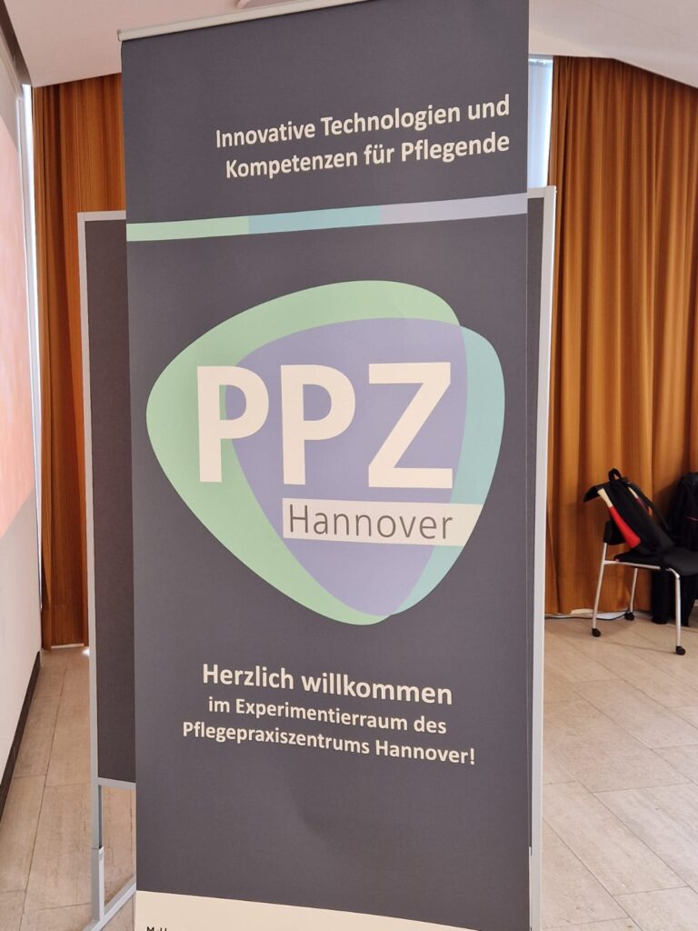 Dr. Regina Schmeer Oetjen, Projektleiterin des Pflegepraxiszentrums Hannover an der Medizinischen Hochschule Hannover, öffnete den Blick in den Experimentierraum und stellte das vom Bundesministerium für Forschung, Technik und Raumfahrt (BMFTR) geförderte Forschungscluster „Zukunft der Pflege“ vor. Sie betonte, dass die im Rahmen des Forschungsprojektes erprobten digitalen Pflegetechnologien eine Möglichkeit darstellen, Patientenversorgung zu verbessern und Pflegefachpersonen in ihrem Arbeitsalltag zu unterstützen und somit den Herausforderungen einer steigenden Zahl von Pflegebedürftigen zu begegnen.